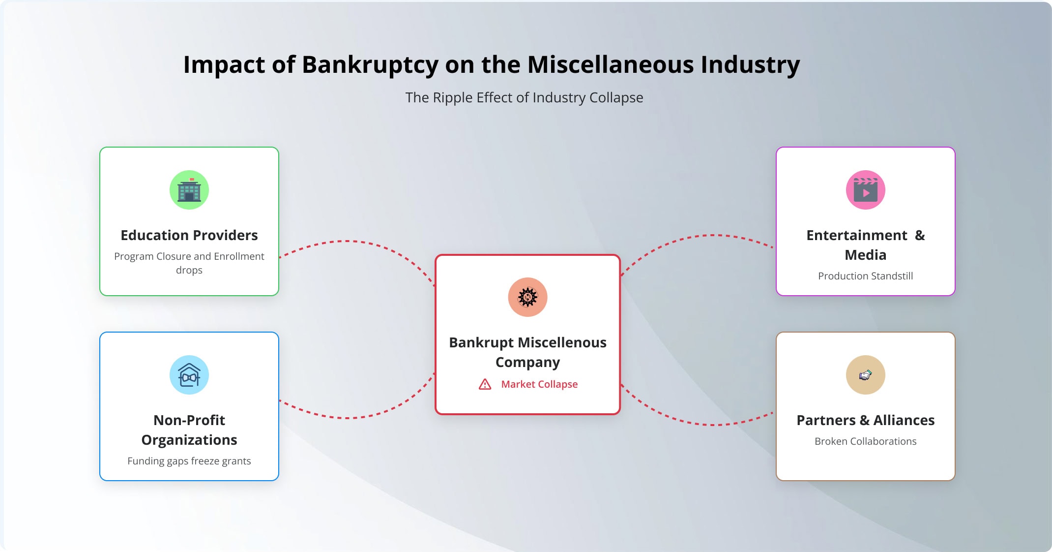 Sudden failures in education, entertainment, media, and non-profits sever critical ties, from halted programs and canceled events to frozen grants and interrupted content streams. Stakeholders across these sectors suffer cascading effects, including lost revenue and eroded trust.